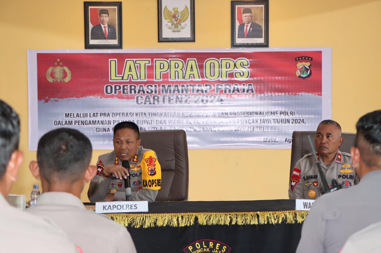 Puncak Jaya, 23 Agustus 2024 – Menjelang Pemilihan Umum Kepala Daerah (Pemilukada) Bupati dan Wakil Bupati Kabupaten Puncak Jaya yang akan digelar pada 27 November 2024, Kepolisian Resor (Polres) Puncak Jaya mengadakan Latihan Pra Operasi (Latpra Ops) Mantap Praja Cartenz 2024. Kegiatan ini berlangsung di Aula Mako Polres Puncak Jaya, Jumat (23/08/2024).