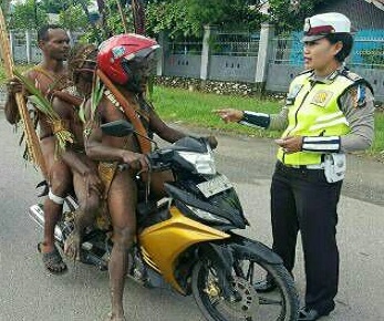 ”Pada saat strong point dilapangan, saya menemukan seorang pria yang mengendarai kendaraan bermotor roda dua dengan mengonceng 2 orang yang tidak memakai helm serta menggunakan kostum adat dan alat tradisonal Papua yang sering disebut Panah“, kata Dina.