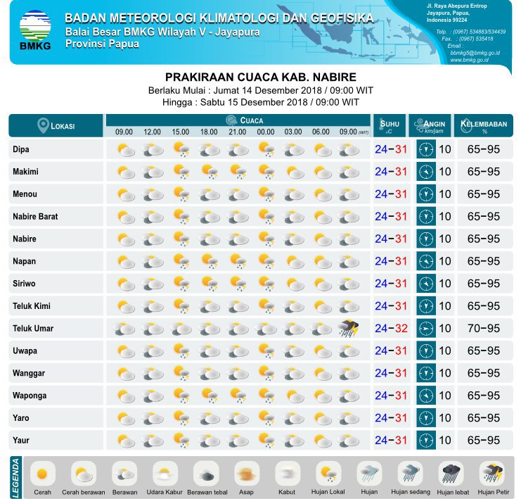 Nabire – Berikut Prakiraan Cuaca kabupaten Nabire, untuk hari Jumat, 14 Desember 2018, berlaku mulai pukul 07.00 pagi wit, yang berasal dari Badan Metereologi, Klimatologi & Geofisika (BMKG) kabupaten Nabire.