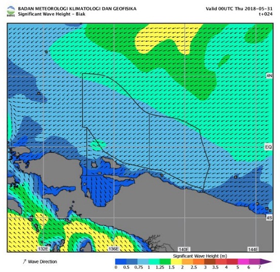 Berikut Prakiraan Cuaca Pelayaran & Tinggi Gelombang Perairan Papua & Papua Barat, Kamis, 31 Mei 2018, berlaku 24 Jam, mulai pukul 09.00 wit.