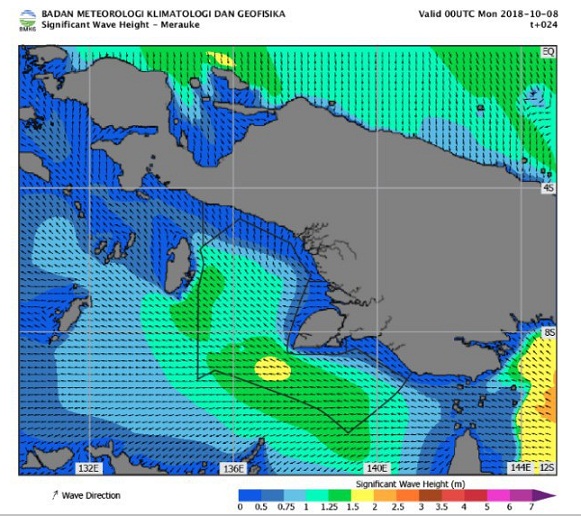 Berikut Prakiraan Cuaca Pelayaran & Tinggi Gelombang Perairan Papua & Papua Barat, Selasa, 9 Oktober 2018, berlaku 24 Jam, mulai pukul 09.00 wit.