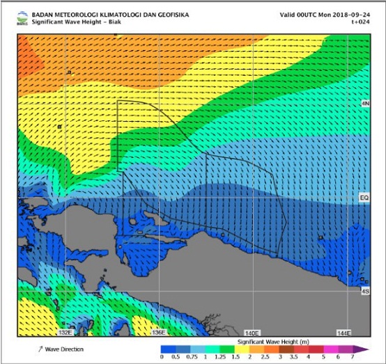 Berikut Prakiraan Cuaca Pelayaran & Tinggi Gelombang Perairan Papua & Papua Barat, Senin, 24 September 2018, berlaku 24 Jam, mulai pukul 09.00 wit.