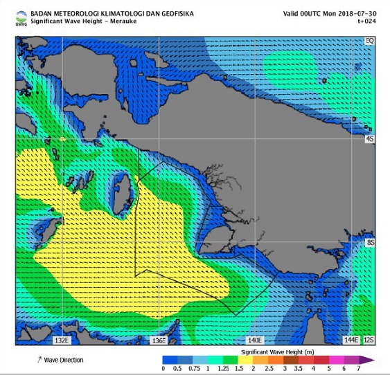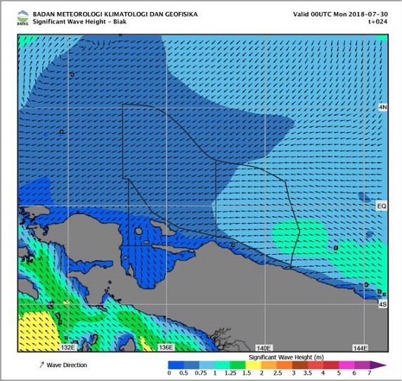 Berikut Prakiraan Cuaca Pelayaran & Tinggi Gelombang Perairan Papua & Papua Barat, Senin, 30 Juli 2018, berlaku 24 Jam, mulai pukul 09.00 wit.