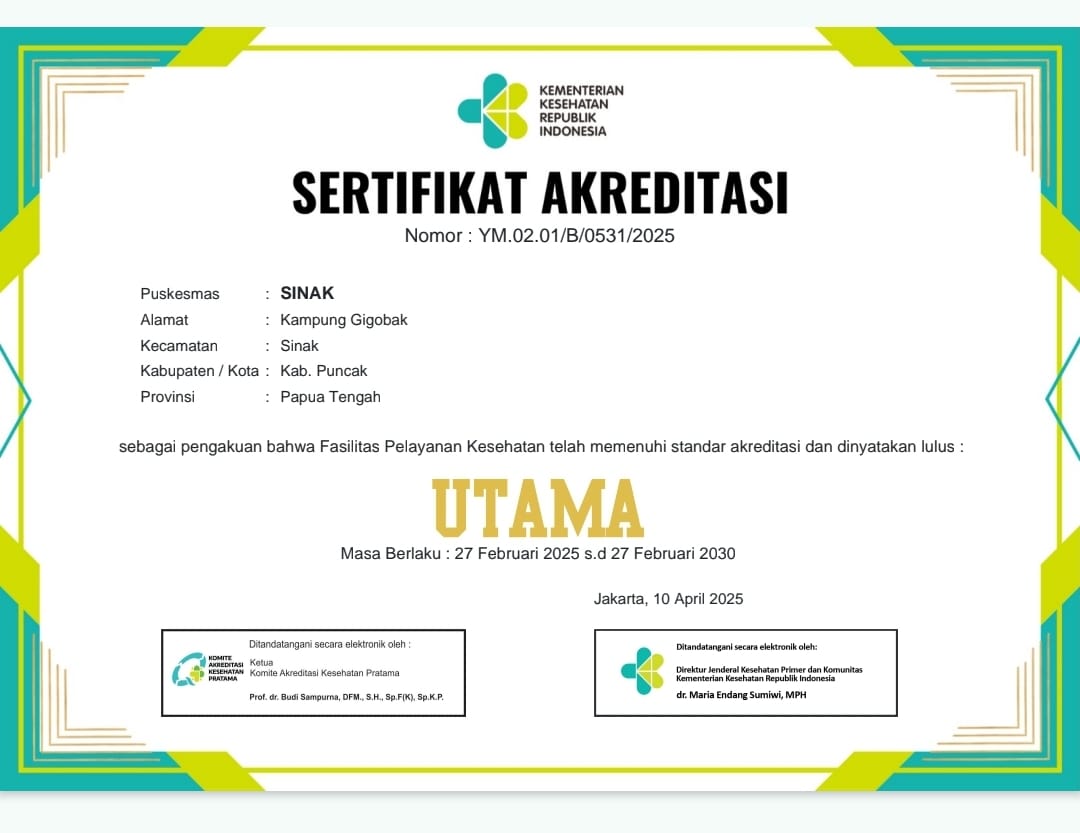 Puncak, 17 Mei 2025 – Puskesmas Sinak yang berlokasi di Kampung Gigobak, Distrik Sinak, Kabupaten Puncak, Papua Tengah, resmi meraih Sertifikat Akreditasi dengan predikat “UTAMA” dari Kementerian Kesehatan Republik Indonesia.