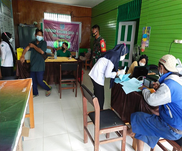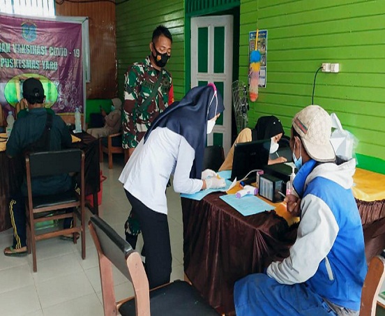 Nabire, Jelang kegiatan pesta olahraga PON (Pekan Olahraga Nasional) XX Papua yang akan dilaksanakan di awal bulan Oktober, Babinsa Koramil 1705-01/Nabire Serka Sigit Aditya memberikan pendampingan dan melaksanakan pengawasan serbuan vaksinasi yang dilaksanakan oleh PKM Yaro Kibisay di Puskesmas Yaro, Distrik Yaro, Kabupaten Nabire, Provinsi Papua, Selasa (28/9/21).