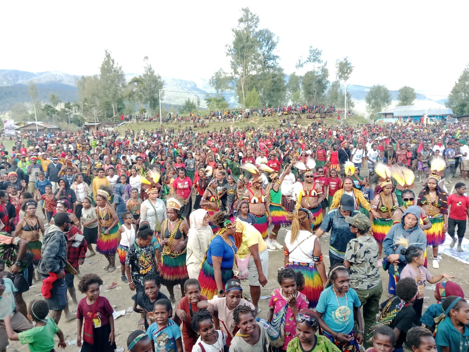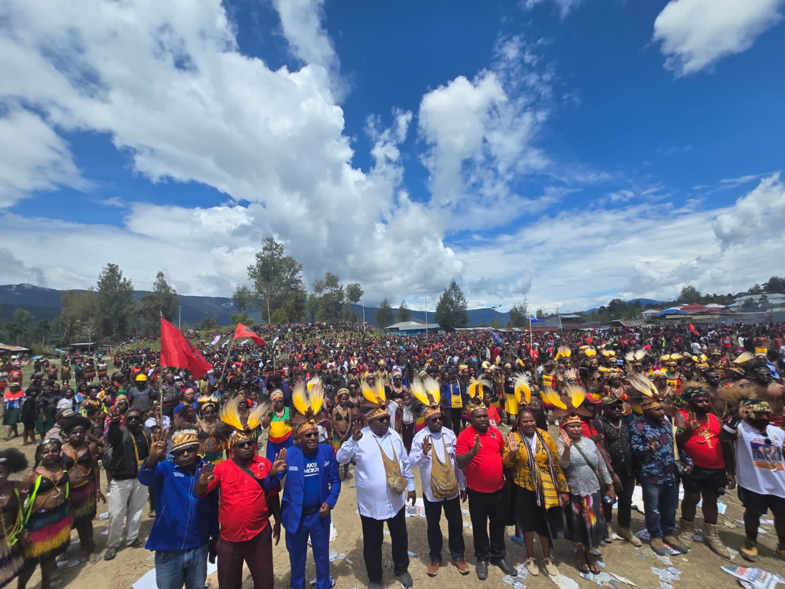 Intan Jaya, 16 November 2024 – Ribuan masyarakat memadati lapangan Yokatapa, Sugapa, Kabupaten Intan Jaya, pada pelaksanaan Kampanye Terbuka pasangan calon Bupati dan Wakil Bupati Intan Jaya nomor urut 4, Oni Dendegau dan Aguni Tapani, Jumat (15/11/2024).