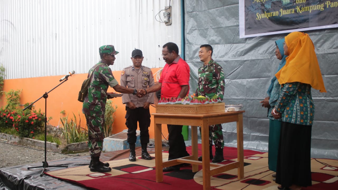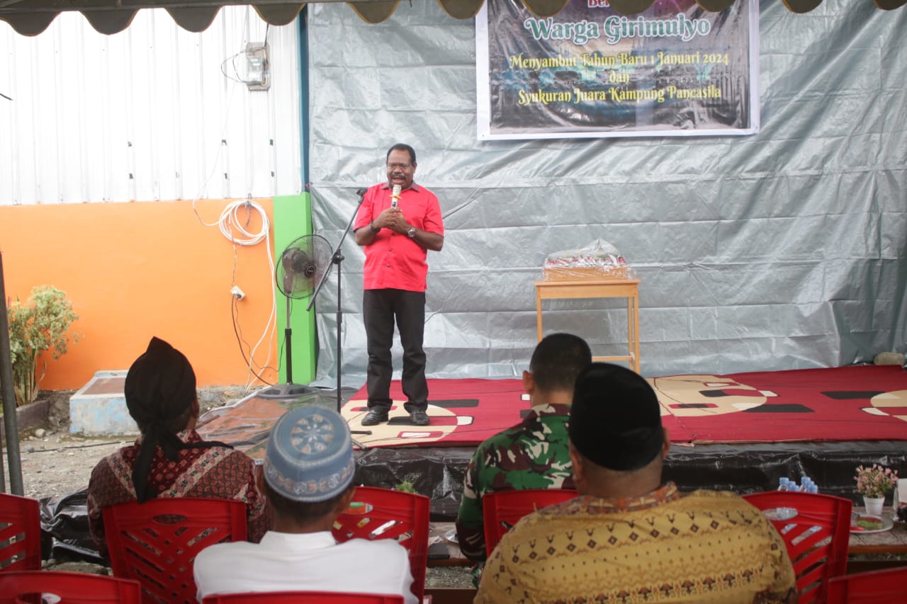 Nabire, Dalam rangka menyambut Tahun Baru 1 Januari 2024, Juara Kampung Pancasila Kelurahan Girimulyo menggelar syukuran bersama serta penyerahan piala Kampung Pancasila dari Bupati Nabire, Mesak Magai, S.Sos., M.Si.