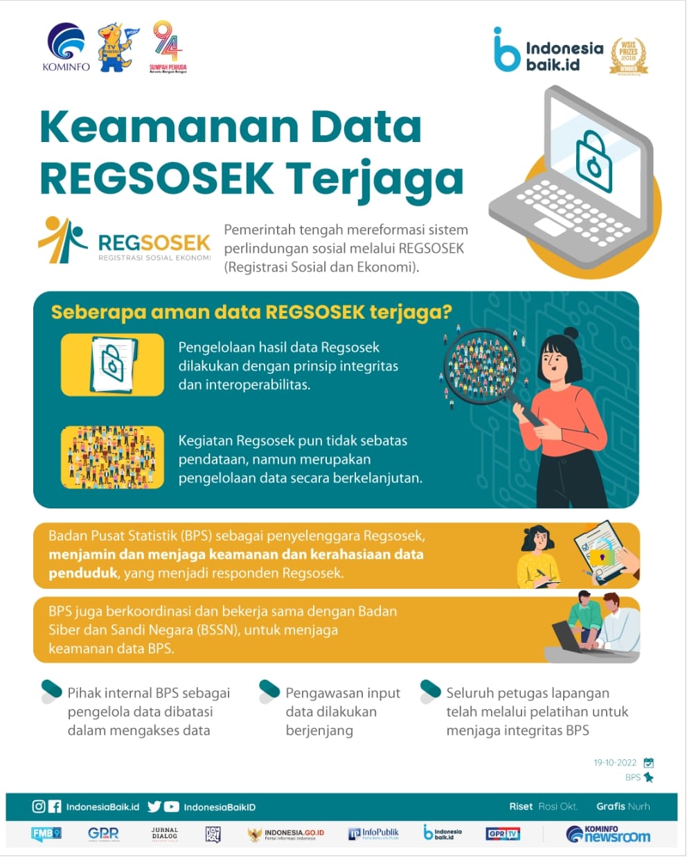 Badan Pusat Statistik (BPS) sebagai penyelenggara Regsosek, menjamin dan menjaga keamanan dan kerahasiaan data penduduk, yang menjadi responden Regsosek. BPS juga berkoordinasi dan bekerja sama dengan Badan Siber dan Sandi Negara (BSSN), untuk menjaga keamanan data BPS.