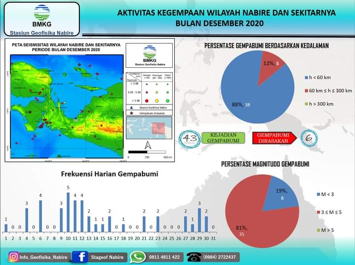 Nabire – Selama bulan Desember 2020, tercatat ada 43 kali akvitias gempa di wilayah Nabire dan sekitarnya. Hal itu tercatat dan teranalisis oleh Stasiun Geofisika Nabire.