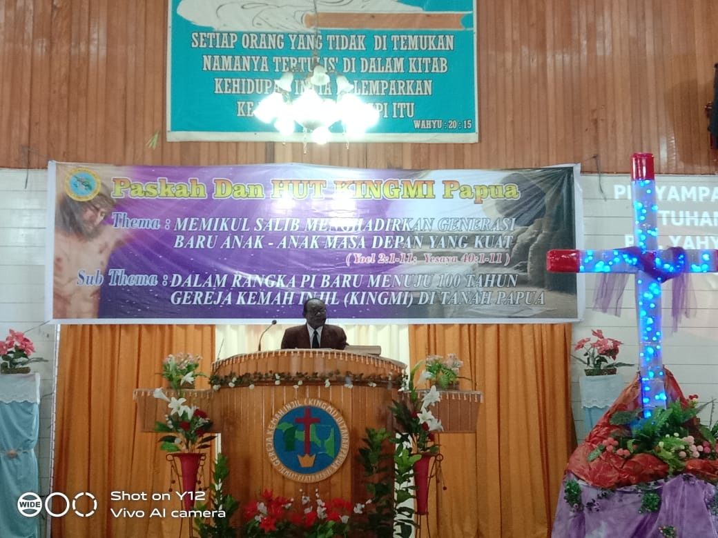 Ibadah berlangsung dengan sorotan thema “Memikul Salib Menghadirkan Generasi Baru Anak-Anak Masa Depan yang Kuat, Yoel 2:1-11; Yesaya 40: 1-11 dan Sub Thema Dalam Rangka PI Baru Menuju 100 Tahun Gereja Kemah Injil (Kingmi) Di Tanah Papua.