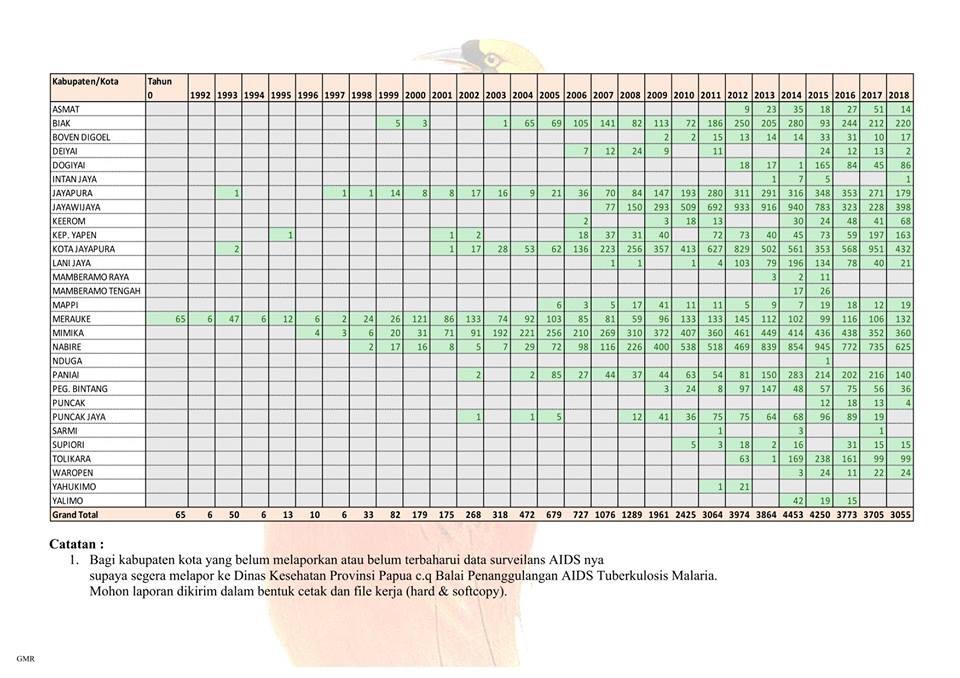 Sedangkan untuk Provinsi Papua sendiri hingga akhir Juni tahun 2018, jumlah kasus HIV/AIDS dari 29 kabupaten/kota se-Papua menembus 39.978 kasus atau naik 1104 kasus dari sebelumnya 38.874 kasus pada bulan September 2018.