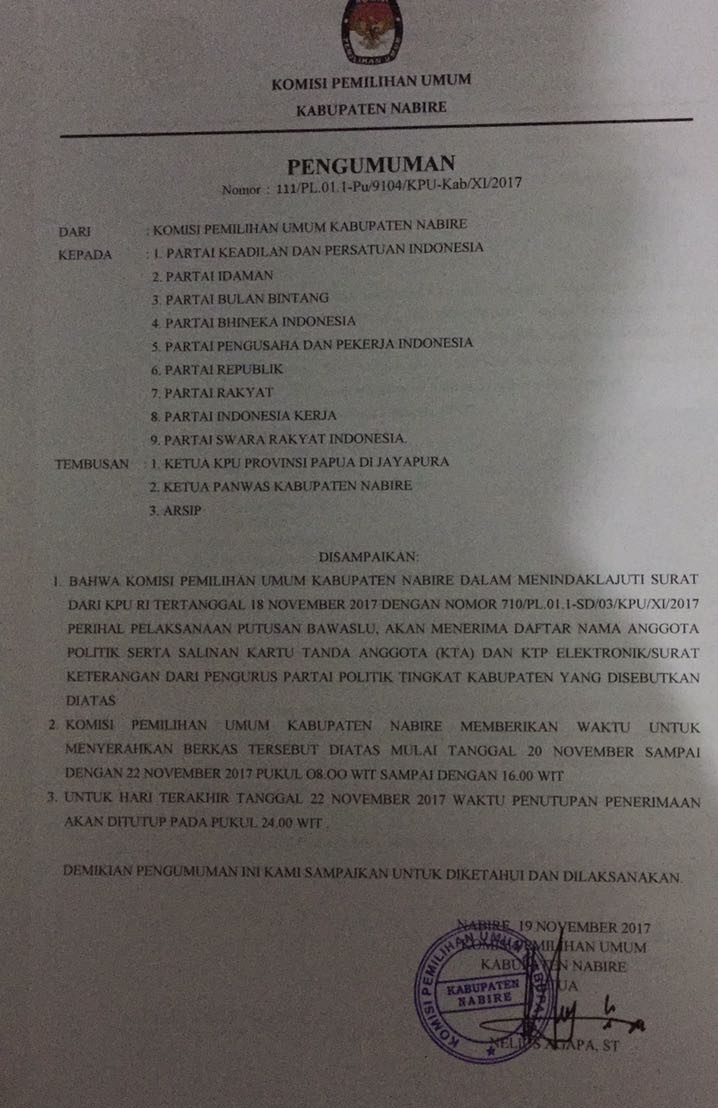 Dalam rangka menindaklanjuti Surat dari KPU RI No : 710/PL.01.1-SD/03/KPU/XI/2017 perihal pelaksanaan putusan Bawaslu RI, maka KPU Nabire akan menerima daftar nama anggota partai politik serta salinan KTA dan KTP Elektronik dari pengurus 9 partai politik yang ada di kabupaten Nabire.