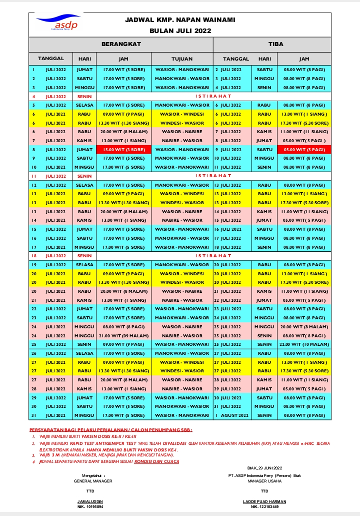 Berikut ini jadwal pelayaran kapal ferry, KMP Napan Wainami selama bulan Juli 2022 :