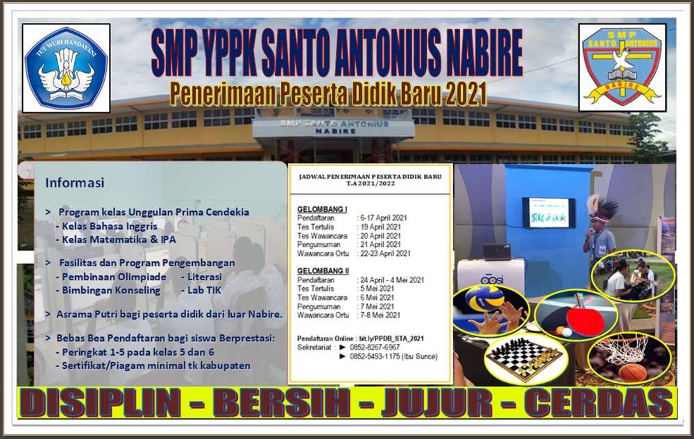 Nabire, SMP YPPK Santo Antonius yang beralamat di jalan Merdeka Nabire, kembali membuka Penerimaan Peserta Didik Baru (PPDB) tahun ajaran 2021.