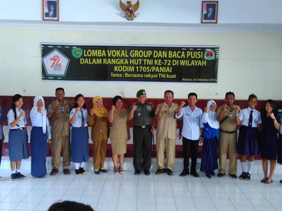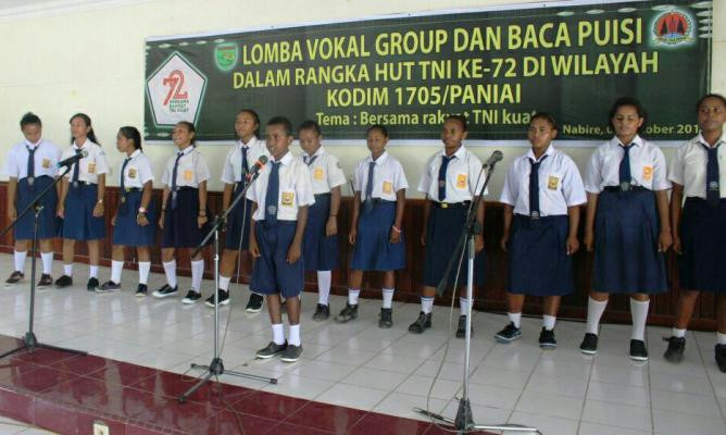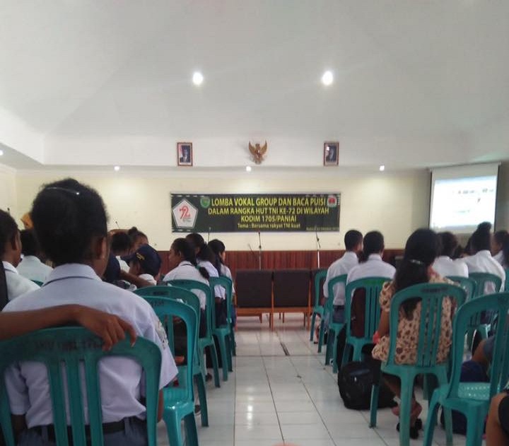 Dalam rangka memperingati HUT ke 72 TNI, tahun 2017, Kodim 1705/Paniai menggelar lomba vokal grup dan baca puisi, yang diikuti oleh para pelajar tingkat SMP dan SMA, bertempat di Aula Kodim 1705/Paniai, senin 2 Oktober 2017.