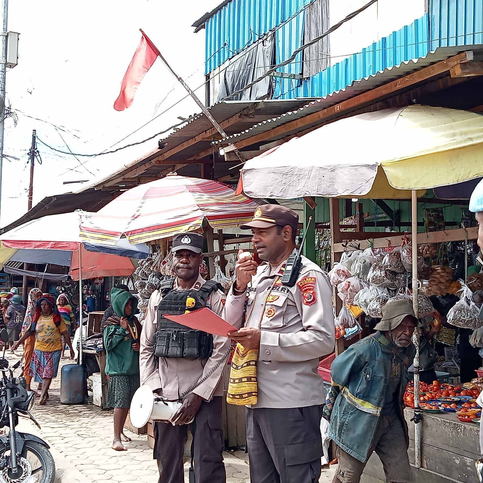 Imbauan larangan membawa sajam disampaikan oleh Kasat Binmas Polres Dogiyai, Ipda Hans N Raubaba,SE, kepada pengunjung Pasar Ikebo.