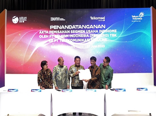 Jakarta, 27 Juni 2023 – PT Telkom Indonesia (Persero) Tbk (Telkom) dan PT Telekomunikasi Selular (Telkomsel) telah menandatangani akta pemisahan (deed of spin-off) untuk mengintegrasikan IndiHome ke Telkomsel.