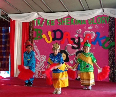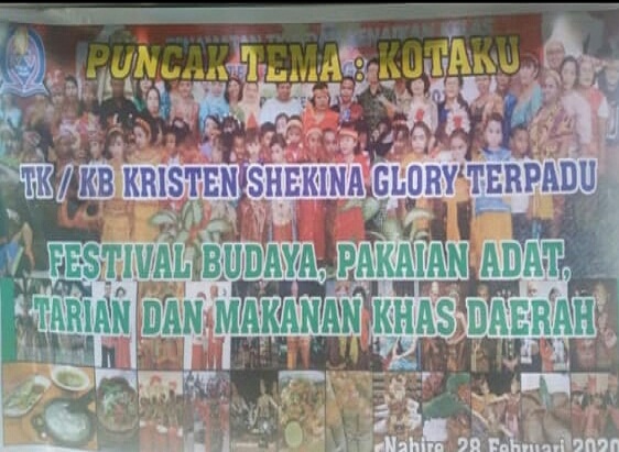 Acara Festival budaya nusantara ini digelar di halaman sekolah TK Kristen Shekina Glory Terpadu pada hari jumat, 28 Februari 2020 jl. Kusuma bangsa yang dimulai pada pk 08.00 – 10.00 WIT bertujuan memperkenalkan ragam budaya, adat istiadat, suku, makanan khas daerah dan tarian kepada anak usia dini dengan menanamkan rasa cinta, menghargai, sikap toleransi terhadap budaya,suku, adat istiadat sendiri maupun budaya, suku, adat istiadat orang lain juga sebagai warisan kekayaan yang harus tetap dijaga dan dilestarikan oleh generasi sekarang maupun generasi yang akan datang dibumi Nusantara tercinta Indonesia.