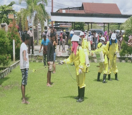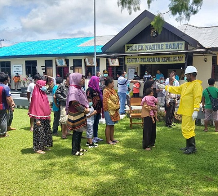 Rombongan setibanya di Polsek Nabire Barat, langsung disemprot disinfektan, kemudian mengikuti pengukuran suhu tubuh, serta didata sesuai protap dari Satgas Covid-19 kabupaten Nabire.