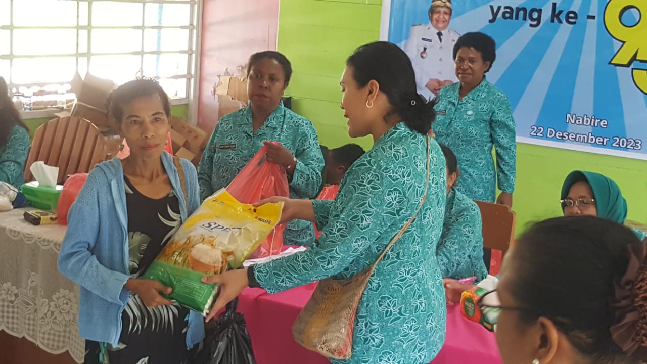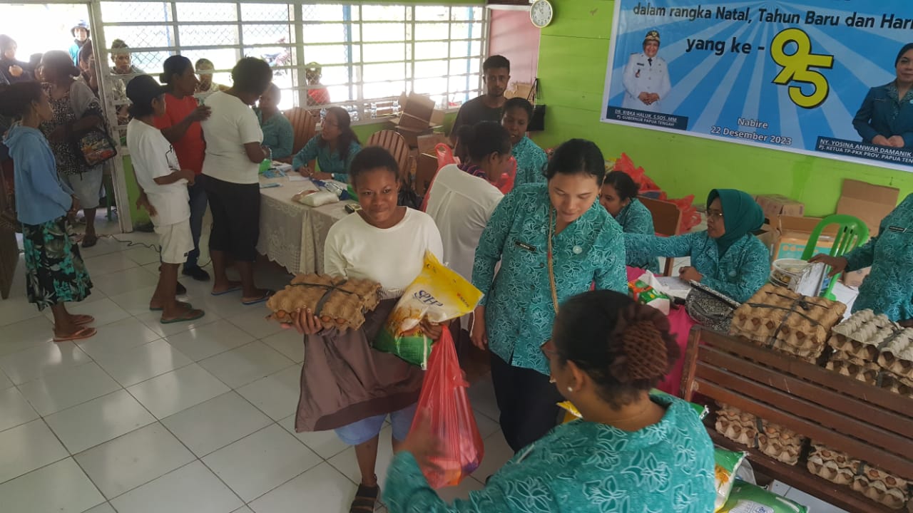 Nabire, Tim Penggerak PKK Provinsi Papua Tengah menggelar Pasar Murah di Kampung Waharia, Distrik Teluk Kimi, Kabupaten Nabire, Jumat (22/12/2023). Pasar Murah itu digelar dalam rangka Hari Ibu ke-95 dan menjelang perayaan Hari Natal dan Tahun Baru.