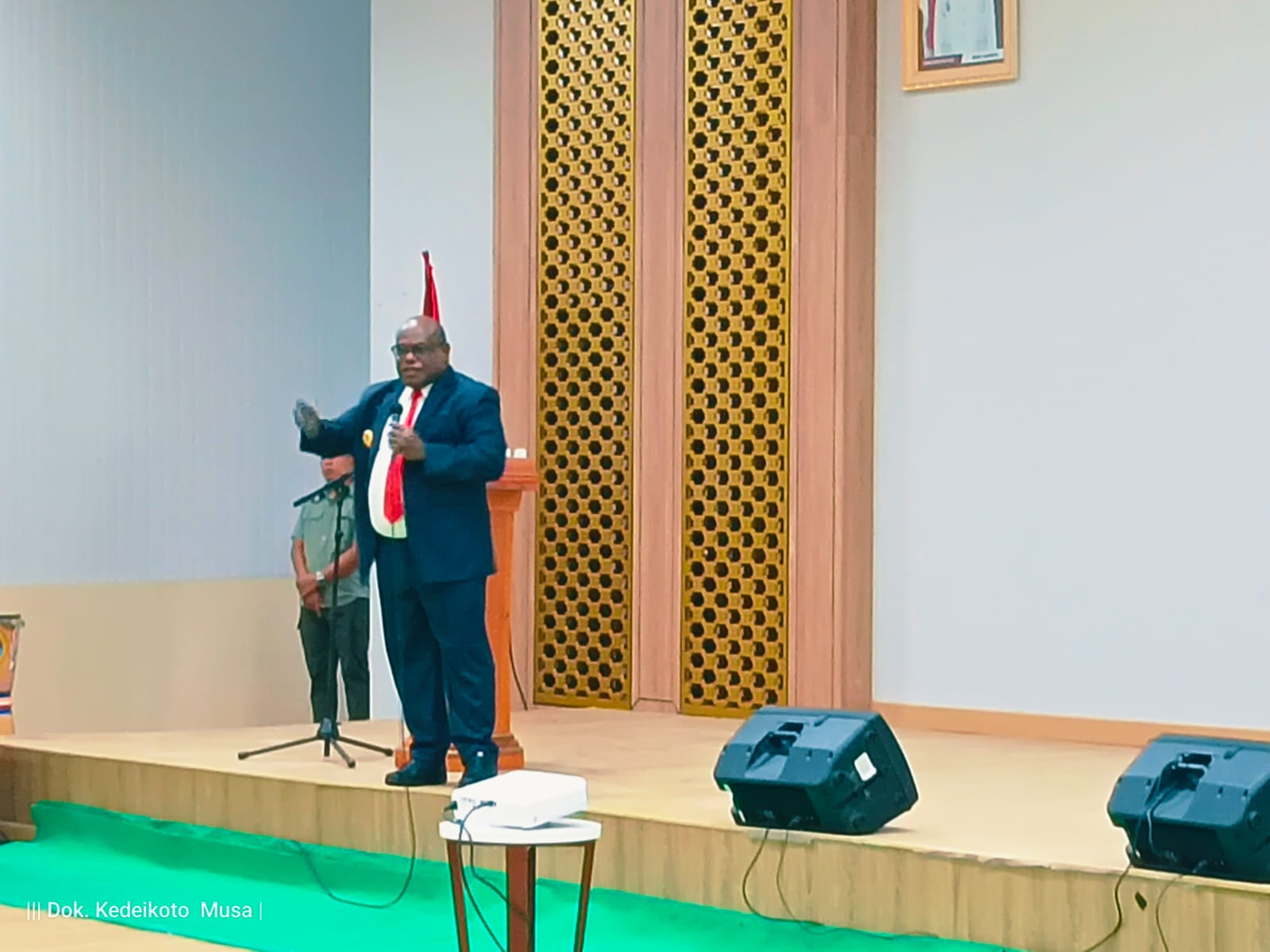 Gubernur Papua Tengah, Meki Nawipa, dalam sambutannya yang penuh semangat dan gaya tutur khas yang membumi, menekankan pentingnya disiplin, kerja keras, dan kepercayaan diri sebagai fondasi utama untuk membangun masa depan Papua.