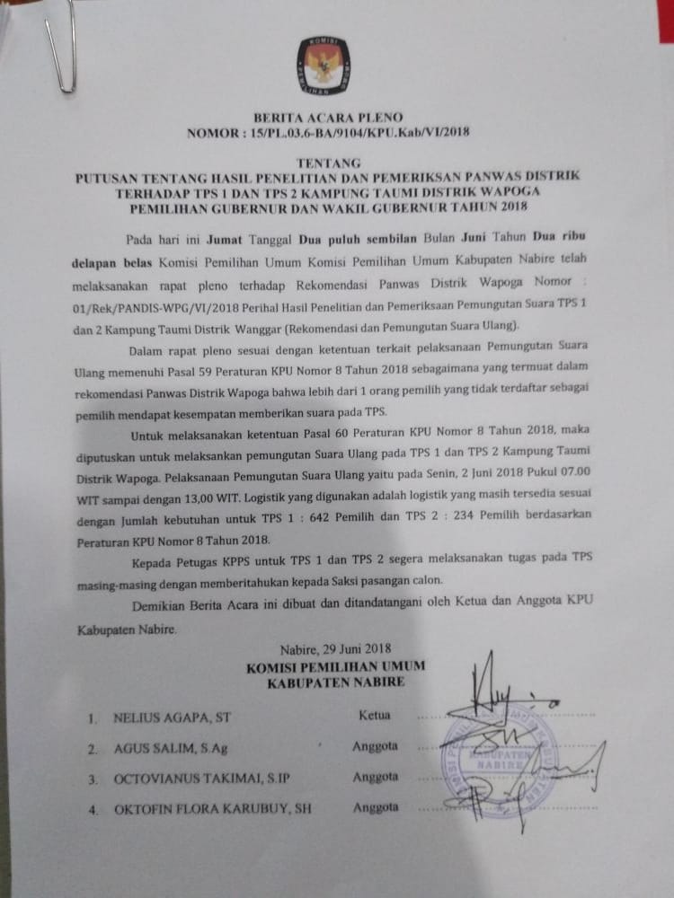 Pasca adanya pelaporan dari Panwas Distrik Wapoga terkait adanya kecurangan di Kampung Taumi, Distrik Wapoga, Nabire pada saat hari pencoblosan Pilgub Papua 2018, 27 Juni 2018 lalu, KPU Nabire akan melakukan Pemungutan Suara Ulang (PSU) di Kampung Taumi.