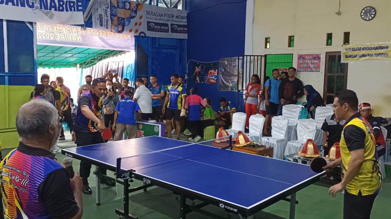 Pembukaan Open Tournament Tenis Meja Bupati Nabire Cup III, tahun 2022 diawali dengan pemukulan bola pertama oleh Wakil Bupati Nabire ke peserta.