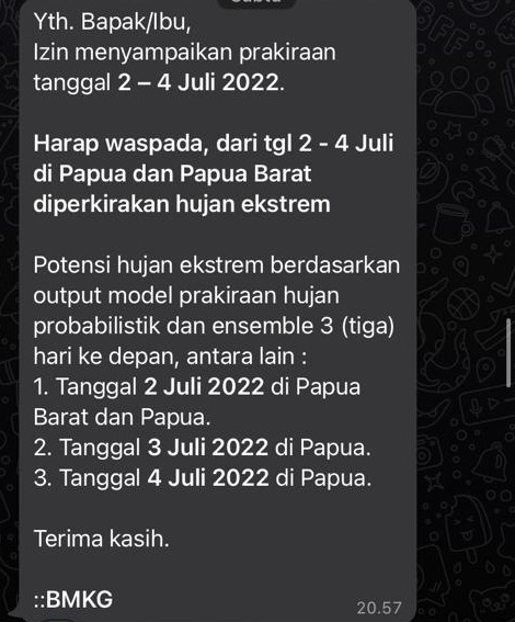 BMKG melaui media Stasiun Meteorologi Enarotali, telah memberikan peringatan dini cuaca buruk selama 3 hari kedepan yang dirilis pada hari Sabtu 2 April 2022 terkait Potensi Cuaca Ekstrem, termasuk pada kejadian 4 Juli 2022.
