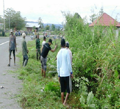Anggota Koramil 1705-04/Napan Sertu Muyani melaksanakan bersih bersih dengan bergotong royong kerja bhakti membersihkan jalan bersama warga Kampung Biha Distrik Makimi.(21/01)