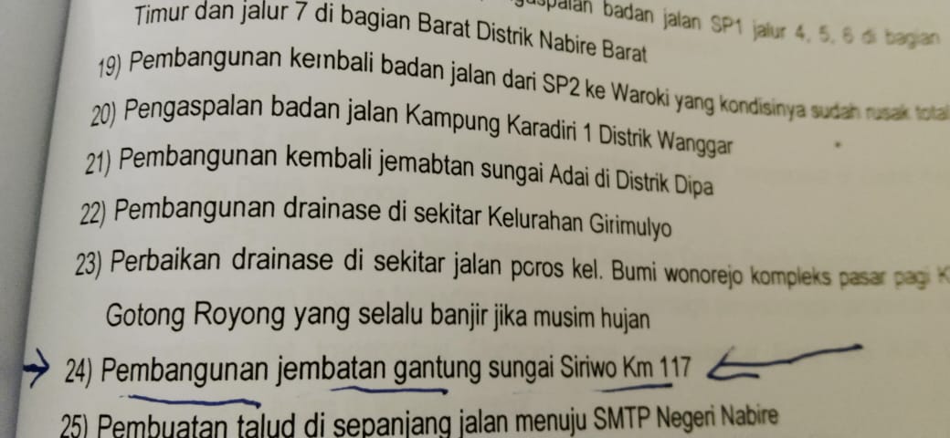 Menurut Enato, untuk pembuatan jembatan gantung di KM 117, dananya menggunakan dana desa. Sedangkan pengaspalan jalan di Distrik Siriwo KM 165, hal tersebut tidak benar.