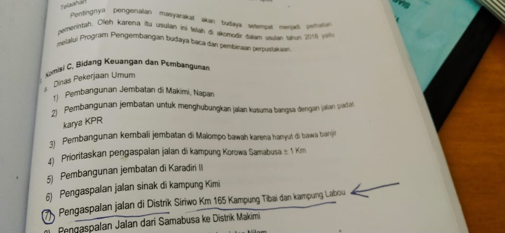 “Kami meminta kepada anggota DPRD Nabire agar segera tanyakan kepada Bupati dan minta klarifikasi LKPJ terkait pembuatan jembatan gantung di KM 117 dan pengaspalan jalan di KM 165,” kata Enato.