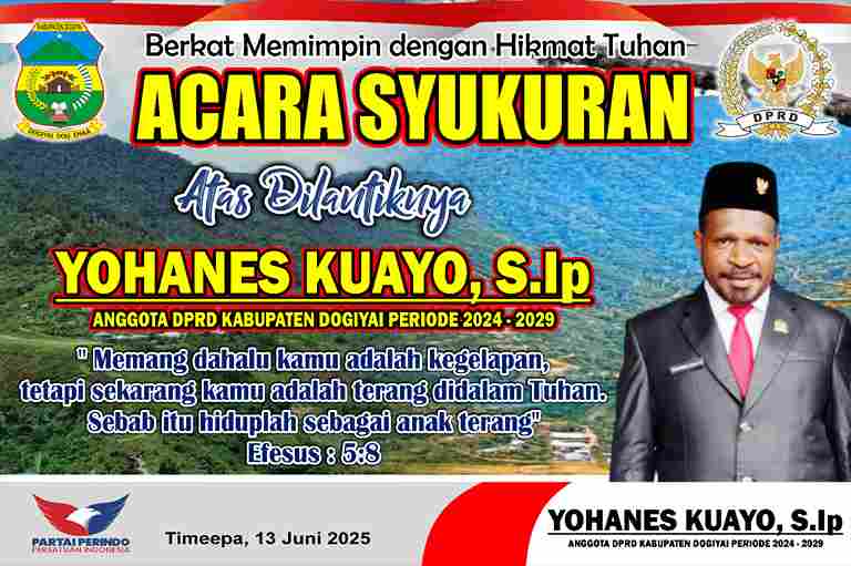 Dogiyai, 13 Juni 2025 – Anggota DPRD Dogiyai terpilih, Yohanes Kuayo, S.IP., menggelar syukuran pelantikannya di Kompleks SD YPPK Santa Maria Timeepa, Jumat (13/6/2025). Mengangkat tema rohani “Dahulu Kamu Adalah Kegelapan, Sekarang Kamu Terang di Dalam Tuhan” (Ef. 5:8), syukuran ini menjadi momentum penuh makna bagi warga Mapia.